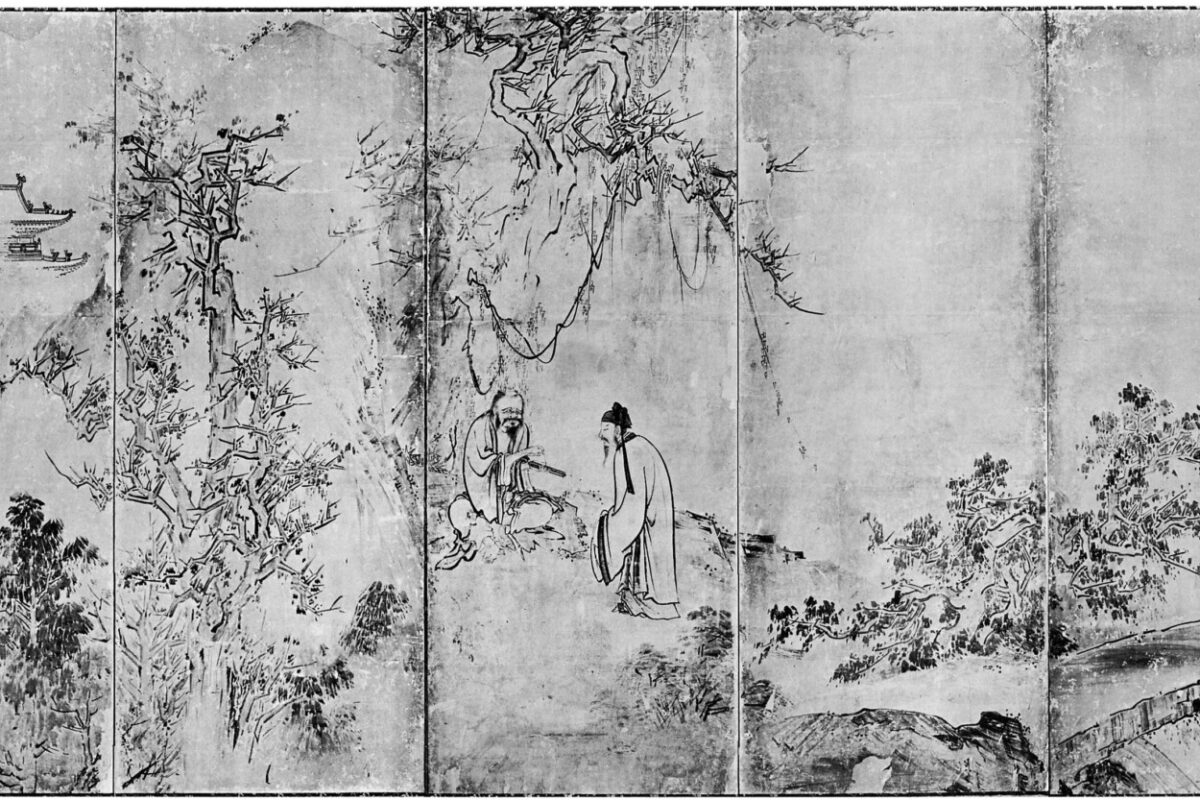 中国の仙人たちを主題とした本図は仙人を取り囲むように描かれた松が象徴的な作品。長谷川等伯50代後半の作とされる。